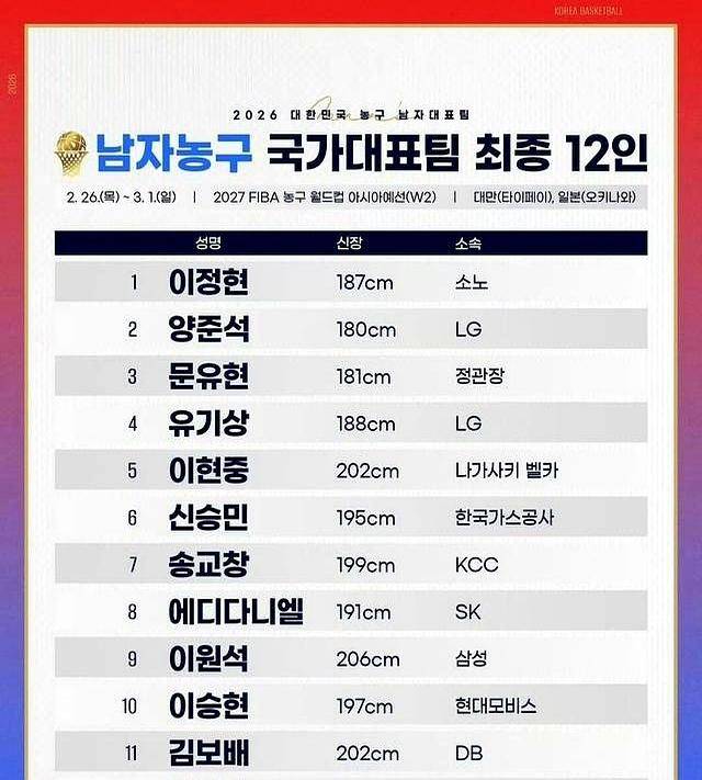 2026世界杯赛程,世界杯投注,世界杯球队阵容,世界杯预测,世界杯直播/全网最全的2026年世界杯专题报道,提供赛程时间表、球队阵容、赔率分析、投注预测与实时比分,助你掌握每一场焦点战况。各位篮球迷们,今天有个重磅消息要和大家分享——韩国男篮正式公布了2027年世界杯预选赛第二窗口期的12人名单!这份名单不仅关乎韩国队接下来的比赛走势,更可能影响整个亚洲篮坛的格局。咱们今天就好好聊聊,这支球队到底有什么看点,以及他们即将面对的挑战。