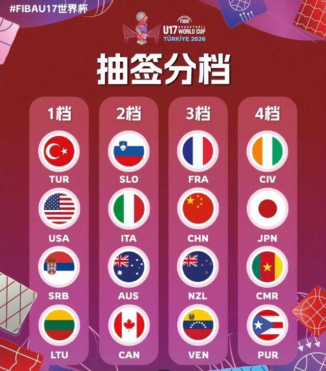 根据目前的抽签分档情况,中国队位列第三档球队,同档次的还有法国队、新西兰队、委内瑞拉队。中国是2025年U16男篮亚洲杯亚军,法国队虽是世界强队,但U17梯队近年成绩波动。