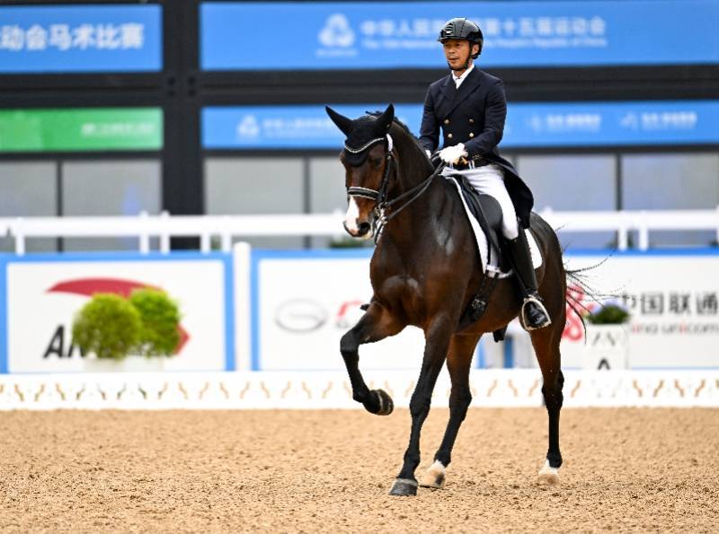 黄焯钦是新会区古井镇人,被誉为“南国马术王子”。从第八届全运会开始,他从未缺席这项国内顶级赛事,共收获5枚团体金牌和3枚个人金牌。11月12日,十五运会马术盛装舞步项目在深圳光明国际马术中心落下帷幕。47岁的黄焯钦第八次踏上全运征程,凭借稳定发挥,与队友协力为广东队夺得团体铜牌,并在个人赛中取得第六名的成绩。