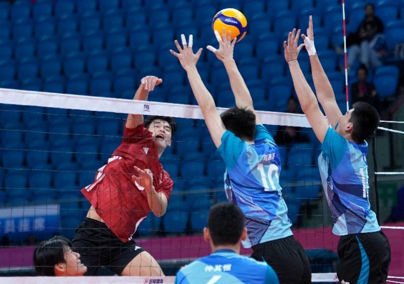2025年11月5日 ,广东队球员仲朗(上左)在比赛中扣球。 当日,在广州举行的第十五届全国运动会排球男子18岁以下组A组小组赛中,江苏队3比0战胜广东队。 新华社记者 李一博 摄