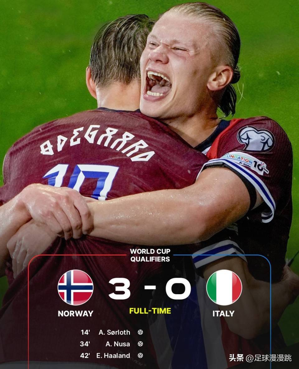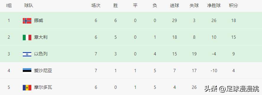 目前,挪威队在小组赛的前6轮中豪取6连胜,积18分高居榜首,进29球仅失3球,净胜球多达26个。首轮他们便以3-0大胜意大利,随后又在主客场双杀以色列,总比分9-2碾压对手,并以16-1的总比分轻松战胜摩尔多瓦。相比之下,意大利队在首轮0-3负于挪威后,虽然接连取得5场胜利,但目前仅积15分,排在小组第二,不仅落后挪威3分,且净胜球相差16个。也就是说,尽管意大利在接下来的两轮比赛中全胜,只要挪威本轮战胜爱沙尼亚,并且末轮不被大比分击败,蓝衣军团将再次无缘直通世界杯,面临附加赛的噩梦。